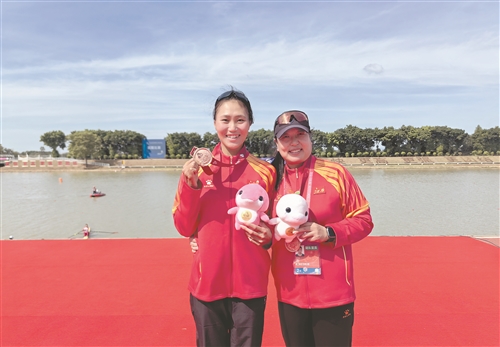 这对自2022年起搭档的组合,早已形成默契。24岁的姚子康眼神锐利,每一次挥桨都带着十足冲劲;22岁的唐海棋性情沉稳,体能与协调性俱佳,作为跟桨者,他稳稳把控赛艇续航节奏。最终,两人以4分38秒61的成绩斩获铜牌。冲过终点线的那一刻,唐海棋激动地与姚子康击掌庆祝。赛后接受采访时,唐海棋声音里还带着激动:“这是我第一次参加全运会,能站上领奖台太不容易了。今天总算圆梦了!”
