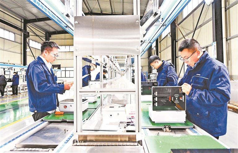 近年来,崇仁县聚焦新能源储能设备、智能充电桩等绿色产品,加强自主研发和科技创新,形成变电设备产业集群。图为11月9日,位于崇仁县的江西变电设备有限公司生产车间内,工人正在生产测试新能源汽车智能充电桩。特约通讯员 朱海鹏摄