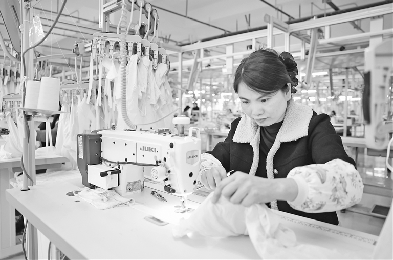近年来,莲花县积极吸纳当地农村人口就近灵活就业,有效带动群众增收。图为11月11日,当地一家服饰企业生产车间,村民在赶制订单。特约通讯员 李桂东摄