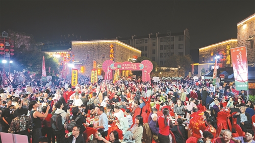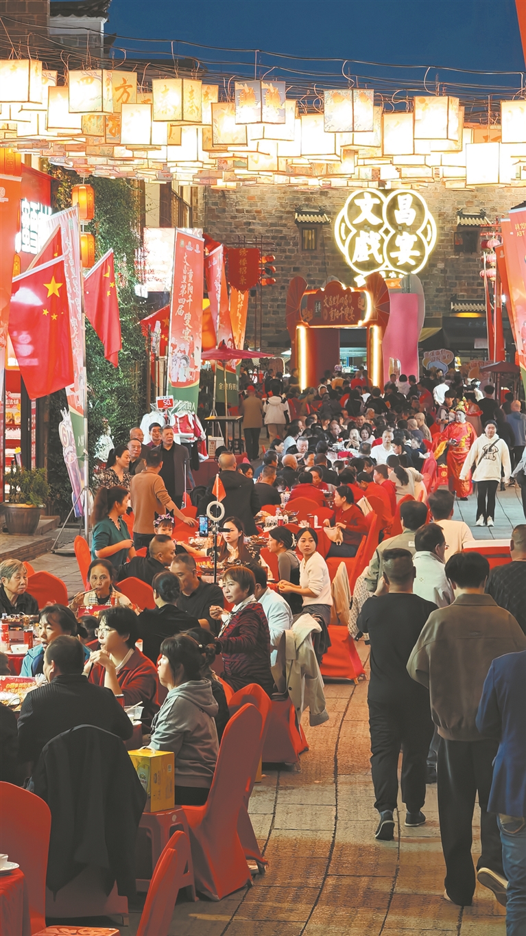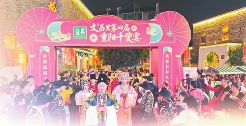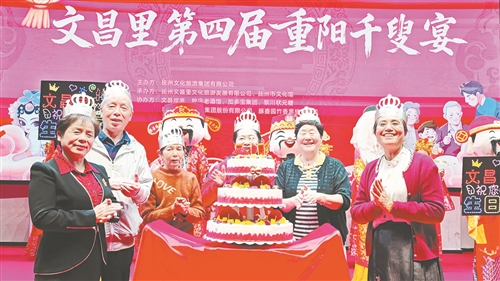 重阳节当天,抚州文昌里历史文化街区张灯结彩、暖意融融。由抚州市文化旅游集团有限公司主办,抚州文昌里文化旅游发展有限公司、抚州市文化馆承办的文昌里第四届重阳“千叟宴”举行,200桌宴席绵延古街,2000余名市民游客、老年长者欢聚一堂,在品佳肴、赏表演中感受传统孝道文化的深厚底蕴。