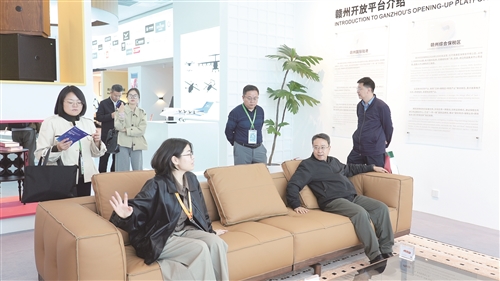 11月5日至10日,第八届中国国际进口博览会在上海举行。其间,赣州市南康区打造的“南康会客厅”在展会惊艳亮相,通过实物展出、沉浸式体验等形式,集中对南康区的名优特产及工业产品进行全方位展览展示。图为参展者在展厅内参观体验南康家具。曾传浩天摄