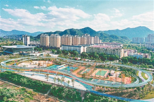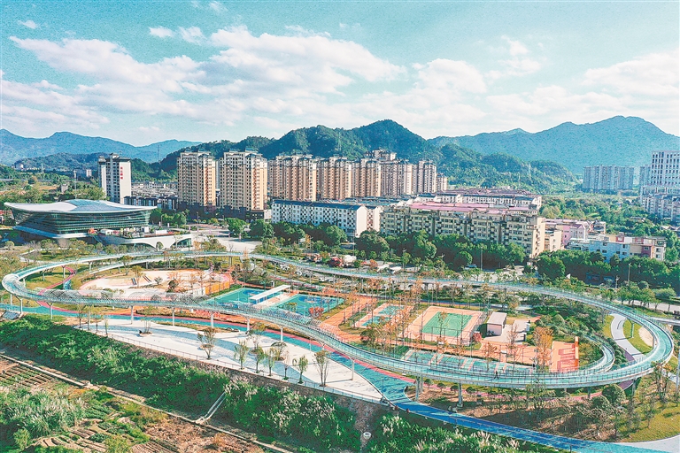 德兴市依洎水河打造占地约280亩的红山文体公园,配套520米空中跑道、多功能球场等设施,将自然景观与运动休闲深度融合。图为11月7日,市民在空中跑道上休闲跑步。本报全媒体记者 徐 铮摄