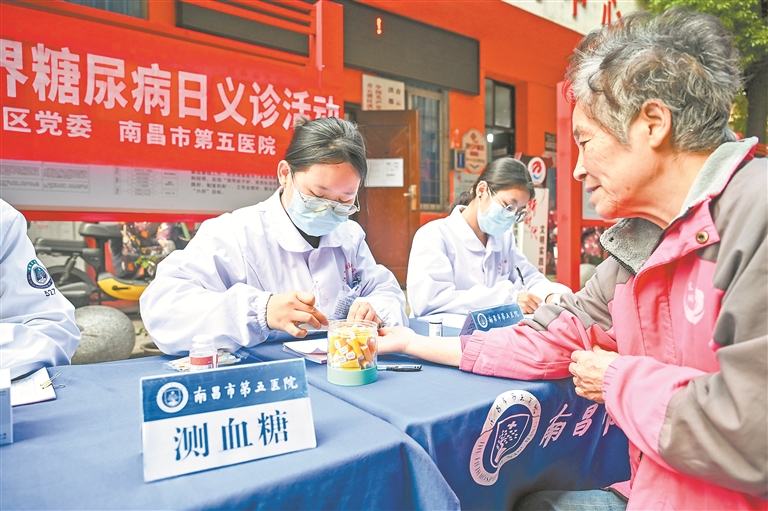 11月12日,在南昌市青云谱区洪都街道洪东社区党群服务中心,南昌市第五医院医护人员为居民进行糖尿病义诊和防控科普介绍,提高居民糖尿病防护意识。
