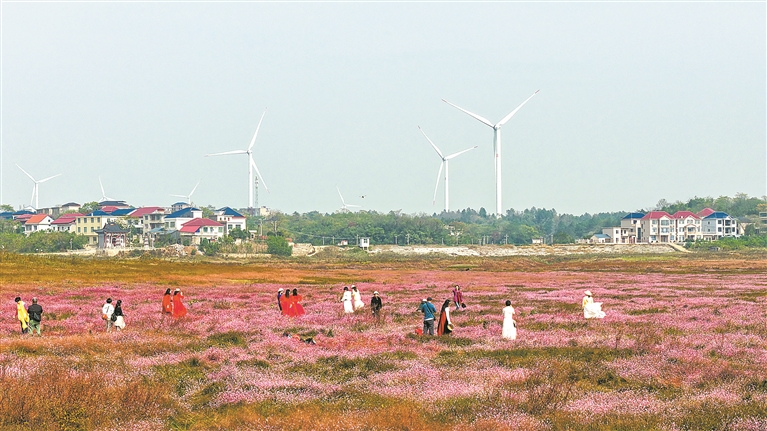 11月11日,庐山市蓼南乡新池村,鄱阳湖进入枯水期后,成片的蓼子花在湖洲上盛开形成花海,与村庄、草地构成美丽的图画,吸引大批游客前来观赏。 特约通讯员 韩俊烜摄
