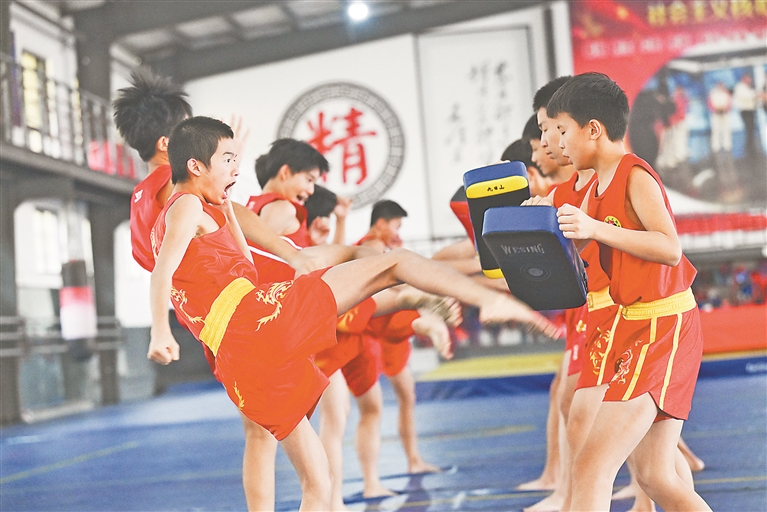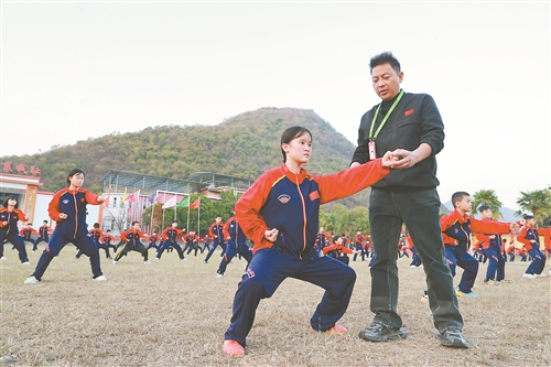 散打训练区内,学生们两两一组展开实战对抗,手靶被击打发出的“啪啪”声不绝于耳;武术套路训练场上,腾空飞脚、旋风腿、旋子,大家动作行云流水,整齐划一,气势如虹。学校校长、国际援外教练员、省级优秀教练邬长平穿行在各个训练区域,亲自示范,讲解发力技巧。