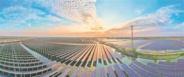 在南昌市新建区松湖镇国家能源200MW渔光互补光伏发电项目现场,3000多亩水面上,一排排光伏板在阳光下熠熠生辉,高效转化太阳能;水面之下,鱼类游动,勾勒出一幅“水上发电、水下养殖”的立体发展图。蔡志强摄
