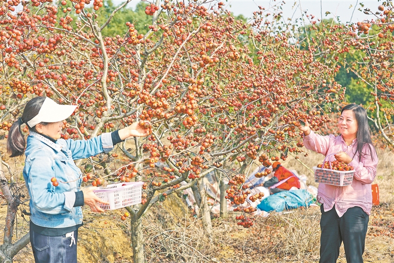 11月16日,九江市柴桑区新合镇址坊村山楂种植基地,500余亩山楂树硕果满枝,村民正忙着采摘山楂,供应市场。特约通讯员 魏东升摄