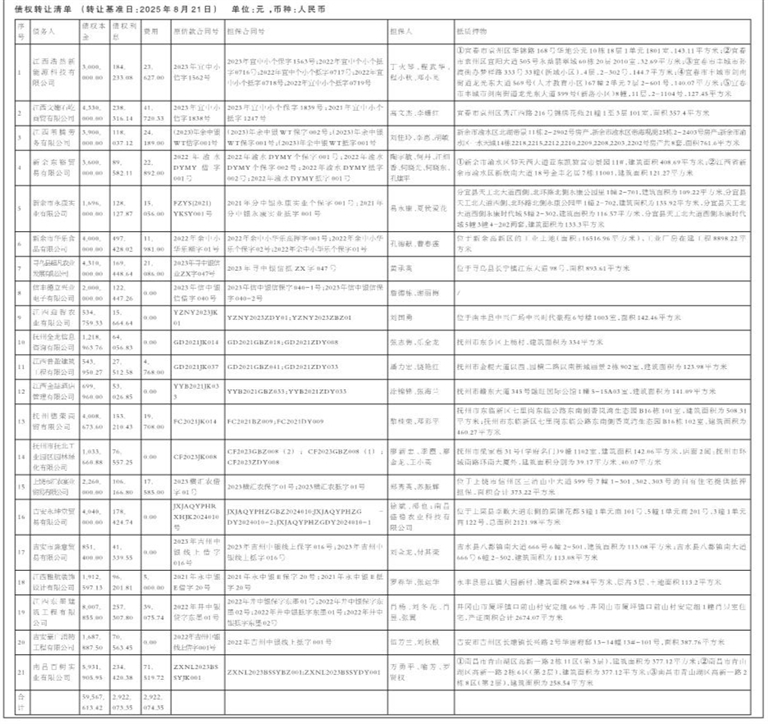 注:1.债权转让清单仅列示截至转让基准日2025年8月21日的贷款本金及利息,借款人应支付给中国东方资产管理股份有限公司江西省分公司的欠息及其他费用按借款合同、担保合同的有关规定计算。