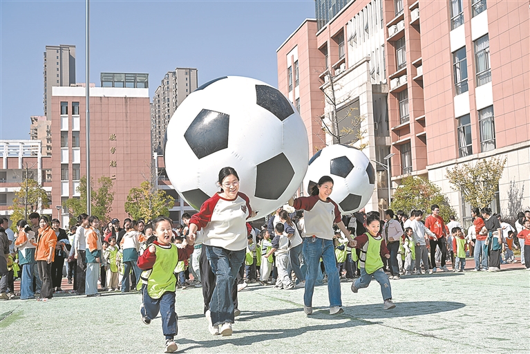 11月15日,抚州市东乡区第二幼儿园的孩子们在家长陪伴下参加亲子趣味运动会,享受足球等运动带来的快乐。特约通讯员 何江华摄