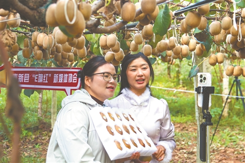 近日,奉新县赤岸镇城下村下梅组万亩猕猴桃基地,县“E旗红”新媒体协会成员正在帮助果农进行直播带货。