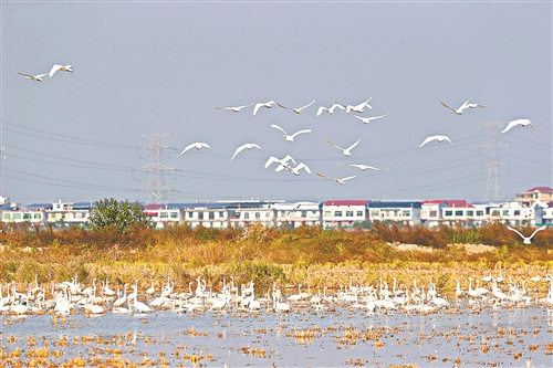 11月20日,在永修县三角乡的一片田野中,候鸟翔集,嬉戏觅食,呈现出一派人鸟和谐,生机勃勃的景象。本报全媒体记者 尹晓军摄