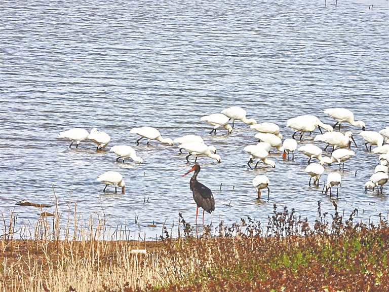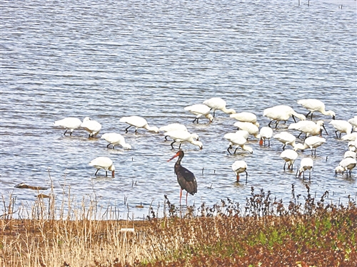 入冬后的鄱阳湖迎来了观鸟季。图为近日,在鄱阳湖余干县水域,黑鹳和白琵鹭“黑白配”构成一幅动人的画面。本报全媒体记者 涂序理摄