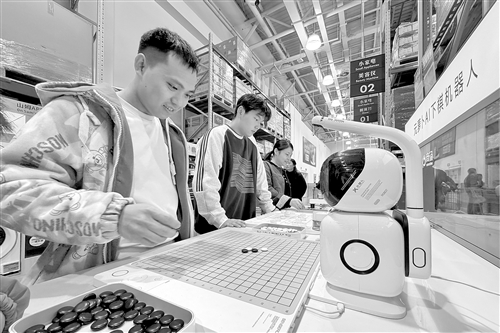 11月25日,南昌市红谷滩区一商场的智能下棋机器人体验区吸引了不少市民。图为市民正在与“AI棋手”一较高下。本报全媒体记者 王蕴蓉摄