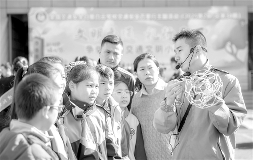 11月29日,南昌市南京路小学联合交警、驾校开展校园交通安全主题活动,90组亲子家庭沉浸式参与车辆盲区探索、醉驾模拟体验、无人机安全穿越等趣味游戏,更直观地感受交通安全的重要性。图为该小学的操场上,专业人员正向学生们介绍无人机安全穿越趣味游戏规则。本报全媒体记者 徐 铮摄