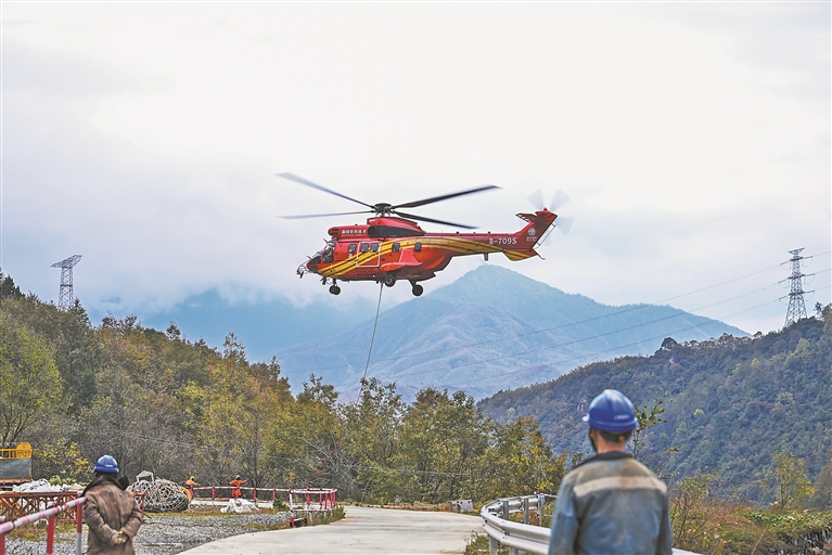 11月18日,记者在茂县土门镇境内看到,一架直升机在空中来回穿梭,将铁塔建材一趟趟地运往施工点。“园区内植被茂密,车辆运输和索道架设都可能对植被造成破坏,直升机运输能最大限度减少施工对生态环境的影响。”该标段项目经理王玥说。
