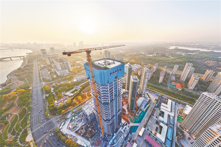 作为省重点工程,位于南昌市红谷滩区的中建三局江西金控数字金融创新产业园项目主体结构已全面封顶,正全力以赴冲刺年度目标任务。图为12月1日,航拍下的项目现场,工人正在进行精装施工。