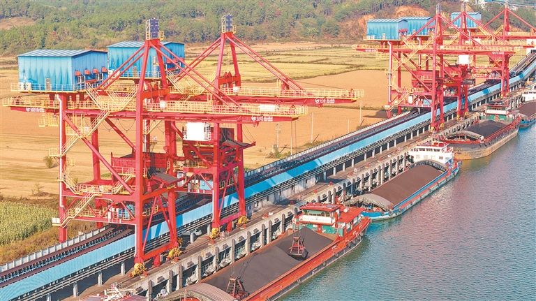 近日,宜春港丰城港区尚庄货运码头,桥吊起重机在装卸煤炭,并通过履带传输带运往火力发电厂发电。特约通讯员 朱海鹏摄