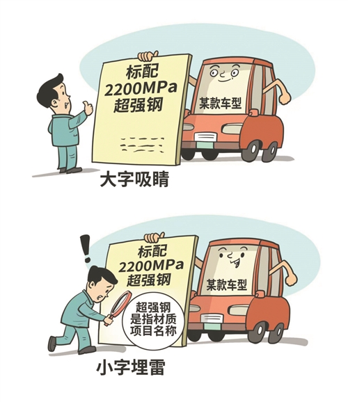 手机产品“逆光之王”的广告语下,藏着“逆光之王是产品设计目标”的小字注解;汽车标榜“2200MPa超强钢”,注解则称“超强钢指材质项目名称”……近期,不少品牌商品广告中的“小字陷阱”频频引发消费者“吐槽”。