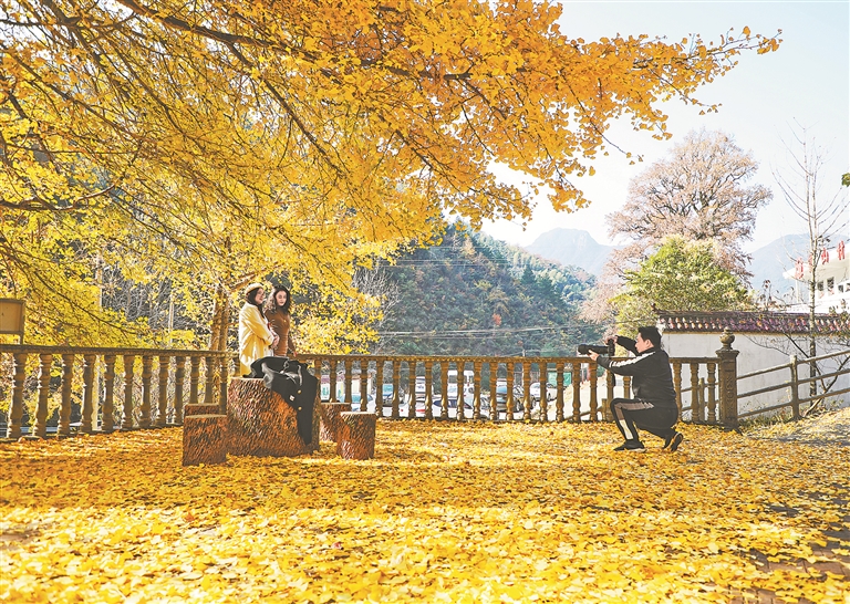 12月4日,横峰县新篁办事处崇山村古银杏迎来最佳观赏期,古银杏叶渐次泛黄,将村庄装点得如诗如画,吸引众多游客前来观光打卡。通讯员 薛 南摄