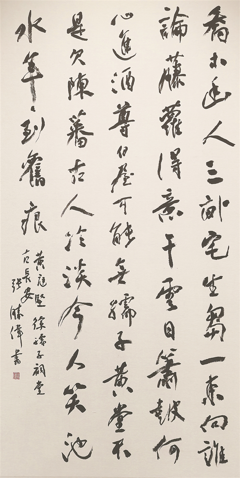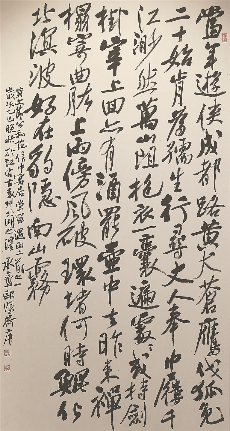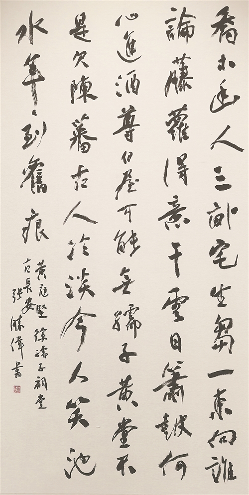 展览以4个板块立体呈现黄庭坚的艺术世界与精神传承。“生平纪略”,展现黄庭坚跌宕传奇的人生与高洁的品格;“存世书迹”,展出黄庭坚37件书法代表作复制件和拓片,包括黄庭坚书《黄处士墓志铭》原碑拓片、经典的楷书代表作《松风阁诗卷》《砥柱铭卷》等,可一览“山谷体”的典型风貌;“当代书家书黄庭坚诗词”,邀请22位省内外书法家进行创作,其中包括中国书协4位现任副主席的作品;“当代传承创新成果”,遴选17件第四届江西省黄庭坚书法作品展优秀作品。当代书法家作品与黄庭坚作品一同展出,既是书法艺术的一种传承,又有向先贤致敬之意,宛如跨越时空的一次艺术“对话”。