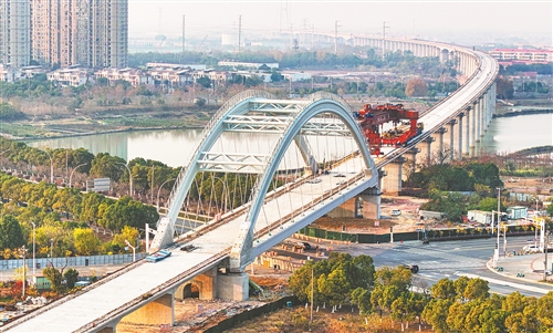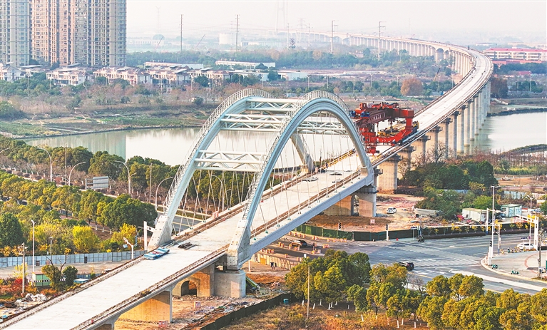 12月9日,随着最后一孔预制箱梁的精准架设,昌九高铁南昌隆兴大桥预制箱梁全部架设完成,为项目全线建成通车奠定了坚实基础。本报全媒体记者 张翰林摄