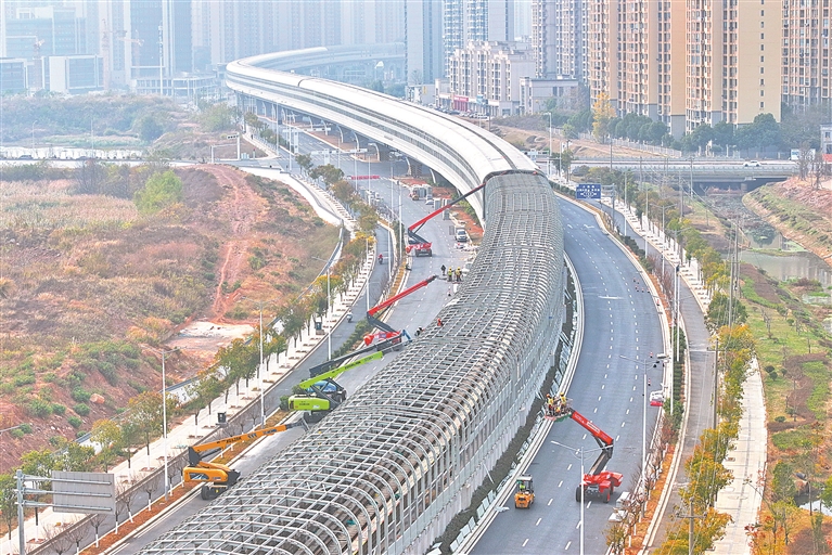 为解决噪声对沿线居民的困扰,南昌轨道交通4号线一期工程高架段正在增设声屏障,预计这项工程12月31日完工。图为12月12日,工人抓紧全封闭式声屏障加装施工。本报全媒体记者 王蕴蓉摄