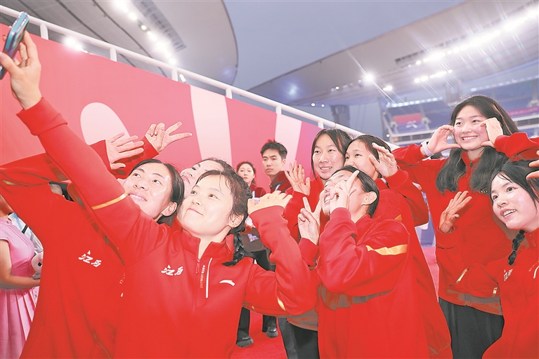 12月12日,在全国残特奥会女子4×100米接力听障比赛中,江西代表团运动员林蒙、江晓兰、张霞、曹旖琦以50秒11的成绩夺得金牌。图为颁奖仪式前,她们邀请其他代表团运动员合影留念。本报全媒体记者 李政昊摄