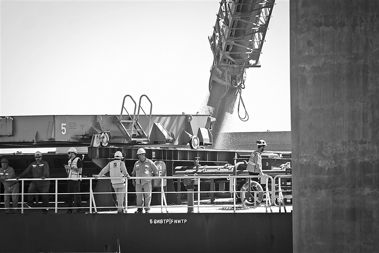 12月13日,在阿根廷圣菲省廷布埃斯港,工作人员在一艘装载阿根廷小麦的货轮旁工作。一艘装载6.5万吨阿根廷小麦的货轮13日从该国圣菲省廷布埃斯港启航前往中国。这是阿根廷2024年1月获得对华小麦出口资质后首次向中国开展小麦商业出口。 新华社发(马丁·萨巴拉摄)