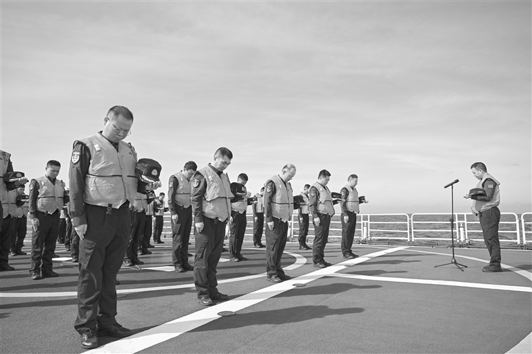 近日,在黄岩岛附近海域执行常态化巡航任务的中国海警黄岩舰执法员举行纪念仪式,为南京大屠杀死难者脱帽默哀。默哀毕,执法员们重温誓词,坚决维护我国海洋权益、捍卫领土主权完整。新华社记者 贝 赫摄