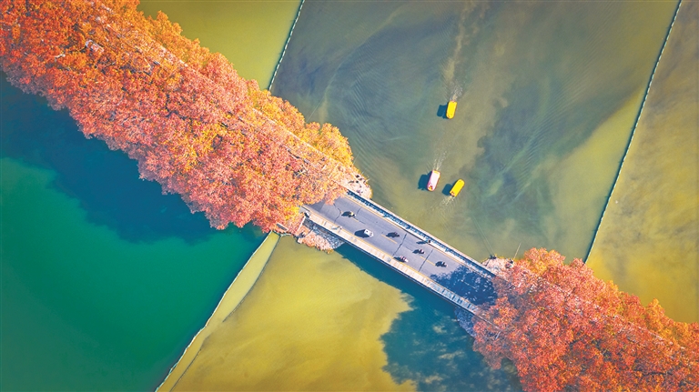 初冬时节的九江甘棠公园,湖畔梧桐层林尽染,橙红金黄交织出暖色调。仿古亭台黛瓦朱墙,在碧水间勾勒出清晰倒影。游船驶过,湖面漾起碎金般波光,步道旁红枫似火,明艳动人。李小明摄