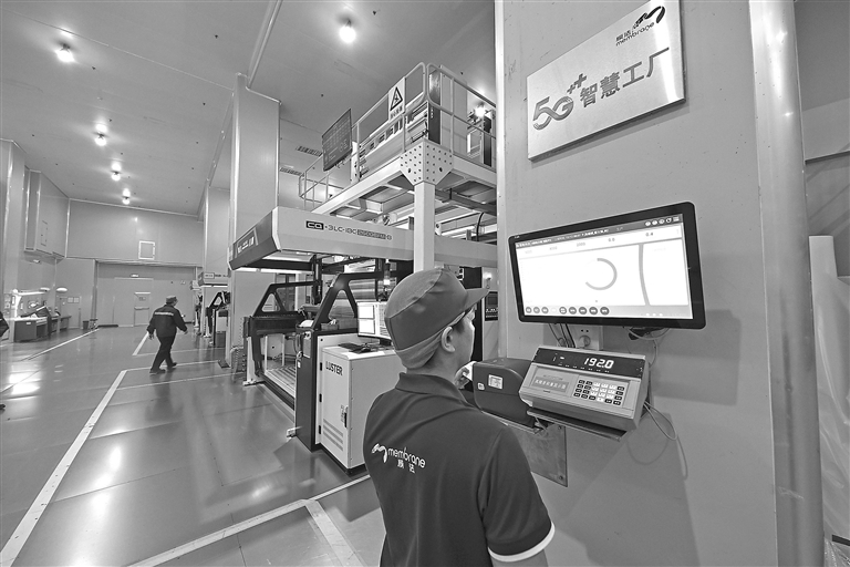 近年来,抚州市东乡区坚持创新驱动发展战略,大力实施技改升级和数转智改网联行动,积极促进产业向高端化、智能化转型。图为12月12日,位于东乡经开区的江西膜法新材料科技有限公司5G智慧工厂车间内,工人在生产线上赶制订单。 特约通讯员 何江华摄