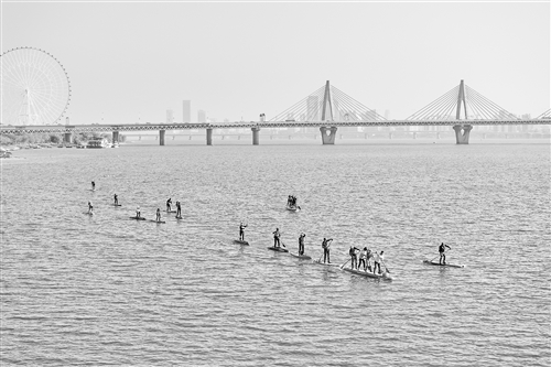 12月14日,在赣江南昌朝阳大桥段,一群水上运动爱好者划着桨板在江面自由穿行,享受着运动带来的乐趣。 本报全媒体记者 洪子波摄