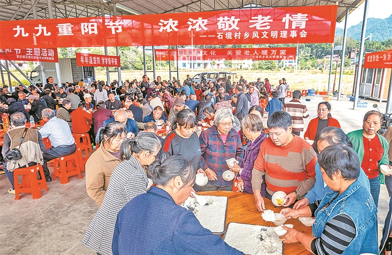 南村村逐渐成为当地乡村治理的典范,治理模式也在全镇得到推广。日前,一场温馨热闹的敬老宴在该镇石境村党群服务中心举行,近百名60岁以上的村民在这里共享美食。今年,石境村陆续成立爱心互助会和乡风文明理事会,聚焦民生需求,推出多项暖心举措,构建起共治共享新格局。