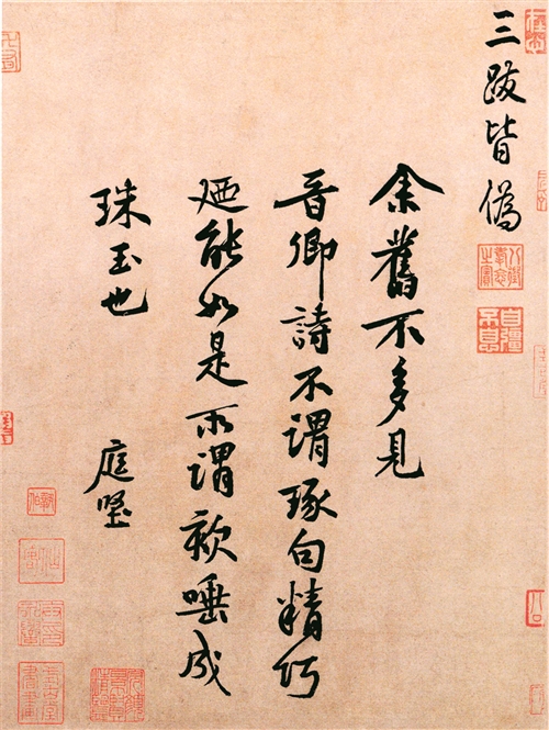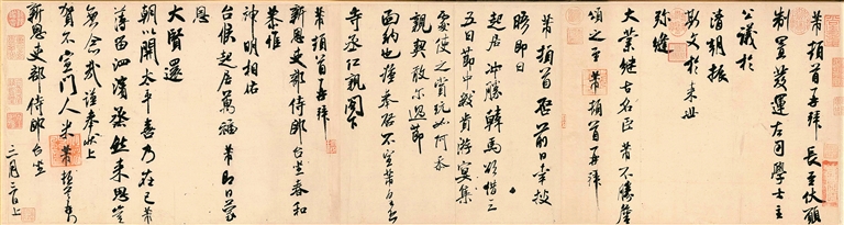 除黄庭坚作品外,另一件重要书法作品是米芾的《行书三札卷》。此卷由米芾三封信札合裱而成:《长至帖》为夏至日祝颂同僚仕途而作;《韩马帖》记录商借唐代韩幹《鞍马图》事宜;《新恩帖》为恭贺新任吏部侍郎的信函。三札虽无书写纪年,但从其神完气足、炉火纯青的典型书风看,估计为其50岁以后的作品。米芾也是“宋四家”之一,与黄庭坚同为“西园雅集”受邀重要嘉宾。