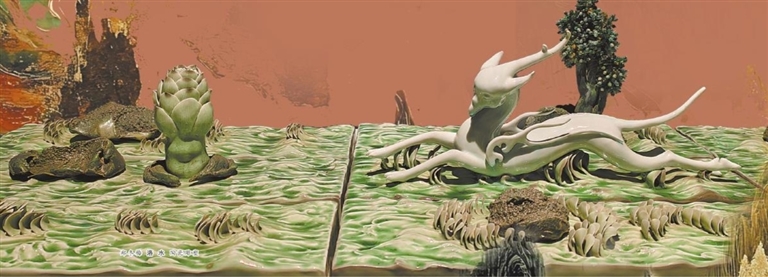 让观众不断发出“哇塞”的,还有《璃光》《洛水》……它们不再是传统图式的“传移摹写”,而有了更加前沿的理念表达。驼队、舞蹈、石窟、藻井、飞天等敦煌代表性意象,依托陶瓷雕塑、瓷板画、艺术瓷瓶与装置等多元形式,“解锁”了更丰富的艺术可能。