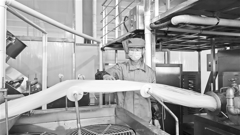 近年来,石城县深挖特色农产品潜力,推动米粉产业标准化、规模化发展。图为12月16日,位于小松镇的江西珍珍天然食品有限公司,工人正在自动化米粉生产线上忙碌。