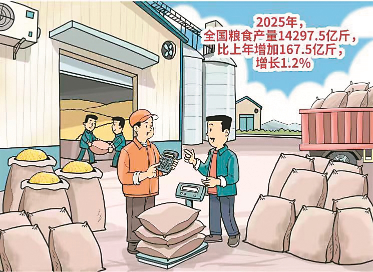 近日,国家统计局发布数据显示,2025年,全国粮食产量14297.5亿斤,比上年增加167.5亿斤,增长1.2%,稳定在1.4万亿斤以上,全国粮食实现丰收。这份沉甸甸的丰收答卷,既是亿万农民辛勤耕耘的结果,也是我国农业高质量发展的生动注脚。