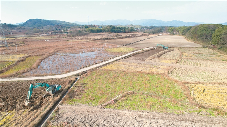 冬闲时节,宁都县各乡镇抢抓晴好天气,加快高标准农田建设步伐,筑牢粮食安全屏障。图为12月18日,石上镇莲湖村,工人正在操作挖掘机进行高标准农田施工改造。