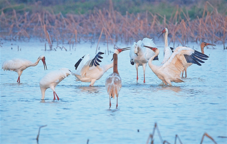 仲冬时节,位于南昌高新区鲤鱼洲管理处的五星白鹤小镇内,成群候鸟或在湿地嬉戏,或在低空盘旋,洁白的羽翼与清澈水域相映成趣,吸引众多游客和摄影爱好者慕名而来。