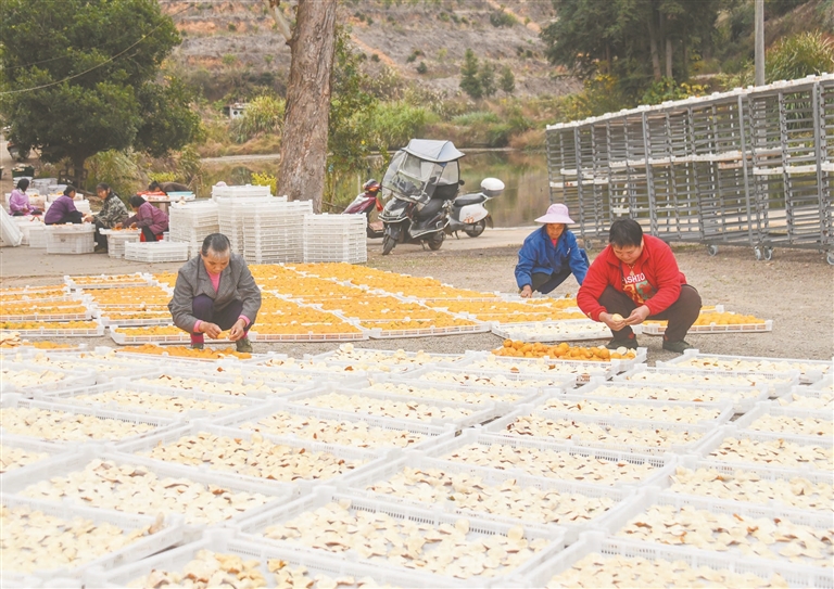 近日,定南县鹅公镇大风村茶枝柑种植基地,村民正忙着用新鲜柑果晒制陈皮。近年来,定南县依托良好的气候环境和土壤条件,大力发展陈皮产业,不仅增加了村民收入,还为当地妇女和老人提供了家门口的就业机会。今年年底,全县茶枝柑种植面积预计达1万亩。张 睿摄