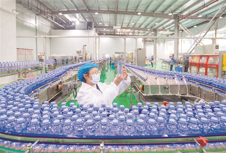 乐安县依托深山优质水源,投资建设占地近2万平方米的永达旅游养泉山活性水厂,项目自今年5月投产后,销售网络辐射全国。图为12月21日,工作人员在生产线上抽检矿泉水。本报全媒体记者 徐 铮摄