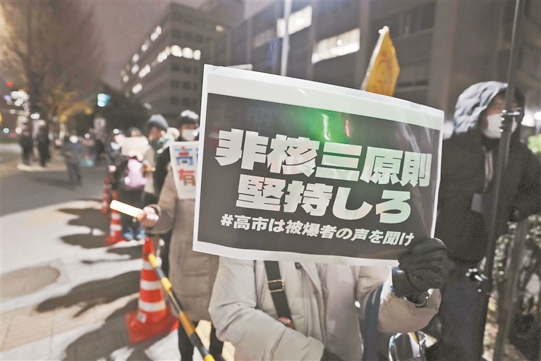 12月23日,在日本东京的首相官邸前,民众参加抗议集会。日本民众23日晚在东京首相官邸前举行抗议集会,要求首相高市早苗撤回涉台错误言论,并批评首相官邸负责安保政策的官员有关“拥核”的言论。
