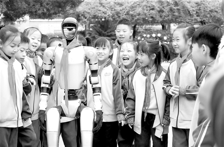 12月24日,大余县东门小学举行第八届校园科技节,通过科学表演秀、人形机器人互动表演、航模表演等活动,激发学生对科学的探索热情,感受科技的魅力。图为当日,学生观看人形机器人互动表演。