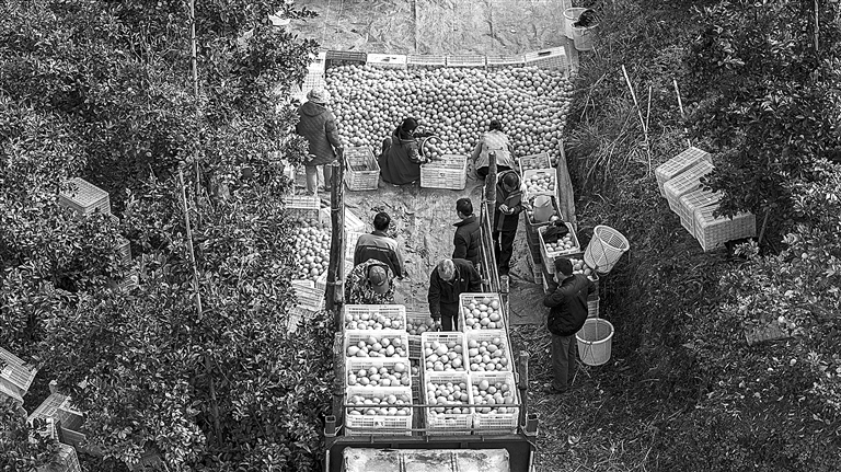 12月28日,大余县吉村镇右源村脐橙园内,村民正忙着采摘、分拣赣南脐橙,一派忙碌景象。截至目前,该镇脐橙挂果量突破1万吨,综合产值超2000万元,带动400余户果农增收。 通讯员 林宗健摄