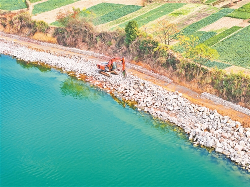 冬闲时节,泰和县大力推进水利建设,筑牢防洪安全线。图为12月23日,塘洲镇洲头村,施工人员正在进行水利岸防修复作业。特约通讯员 邓和平摄