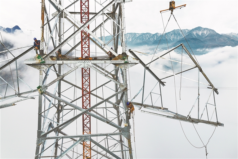 | 2025年11月20日,四川省阿坝藏族羌族自治州茂县富顺镇境内,绵延的高山之巅云遮雾绕,江西省送变电工程有限公司的工人们爬上高塔进行组塔作业。 洪子波:在高海拔的四川崇山峻岭中,架设一条特高压输电线路,工程难度之大可想而知。工人们不畏严寒、翻山越岭,为“西电东送”工程贡献自己的力量,令人感佩! |