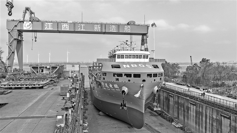 2025年12月31日,740TEU纯电动敞口集装箱船“宁远电鹏”号在湖口县下水。该船为“宁远电鲲”号的“姊妹船”,也是万吨级纯电动高端智能海船,可实现营运及靠泊装卸货全程零排放。特约通讯员 沈海斌摄