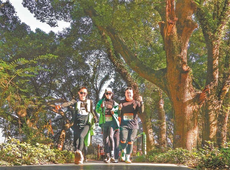 选手们穿梭在青石板古巷,两侧民居整齐排列,砖雕门楼的斑驳纹路似在诉说着岁月故事。行至龙湖古桥,选手们远眺乌江田园,而后便穿出古村踏入山野。田埂小径蜿蜒,远处丹霞山峦起伏,大家攀登陡坡、跨越缓丘,在山野间奋力前行。此时,樟香萦绕、光影斑驳,选手们跑入千年古樟林,沿乌江畔赛道进发,尽情感受越野登高的酣畅。