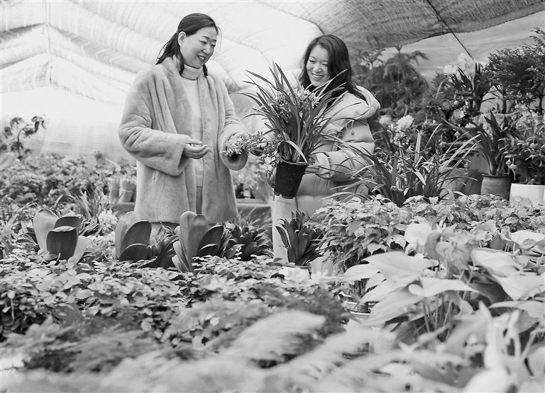 1月5日,在河南省南阳市城乡一体化示范区白河街道一家特色产业种植园,花农在温室大棚里为顾客介绍花卉品种。 新华社发(高 嵩摄)