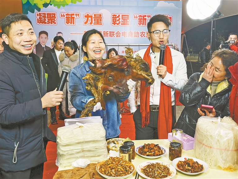 1月3日晚,都昌县新的社会阶层人士联谊会电商助农活动在该县人民广场举行,2个多小时的直播累计有10万人次观看,共成交800多单,销售额3万多元。 本报全媒体记者 曹章保摄
